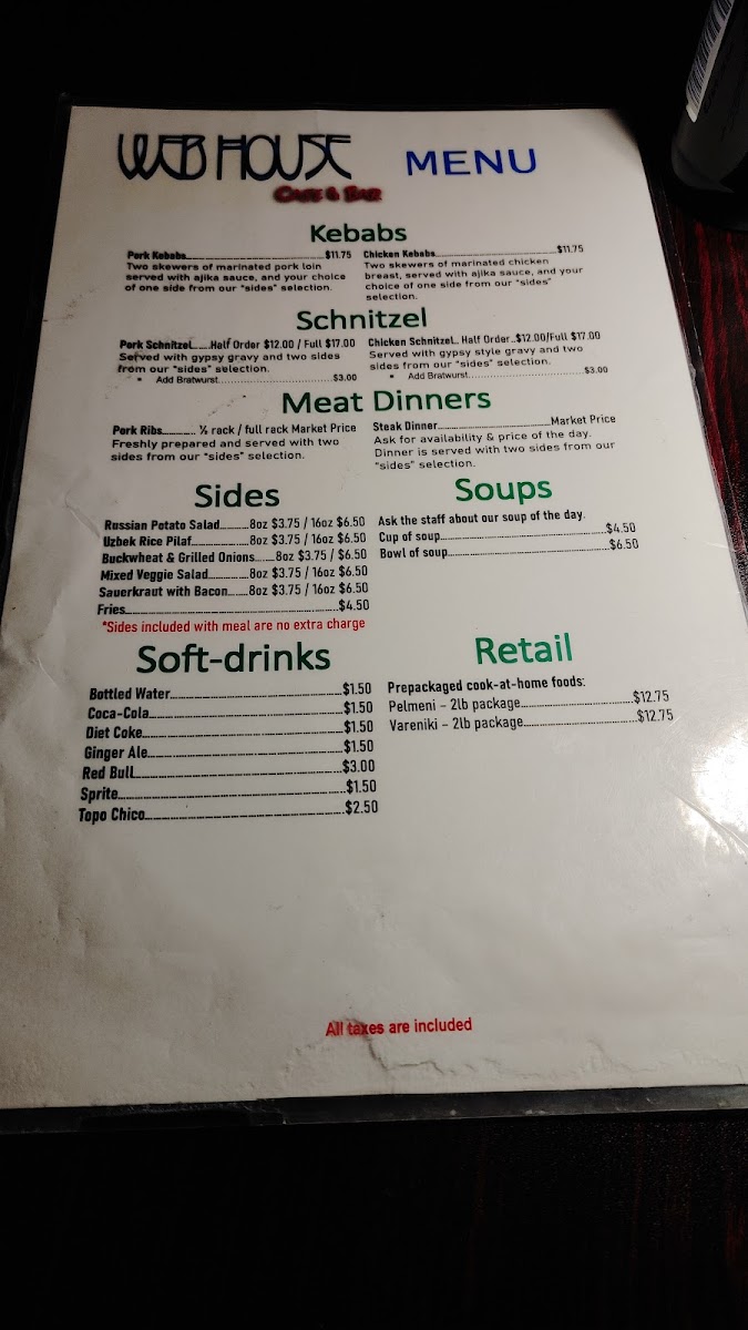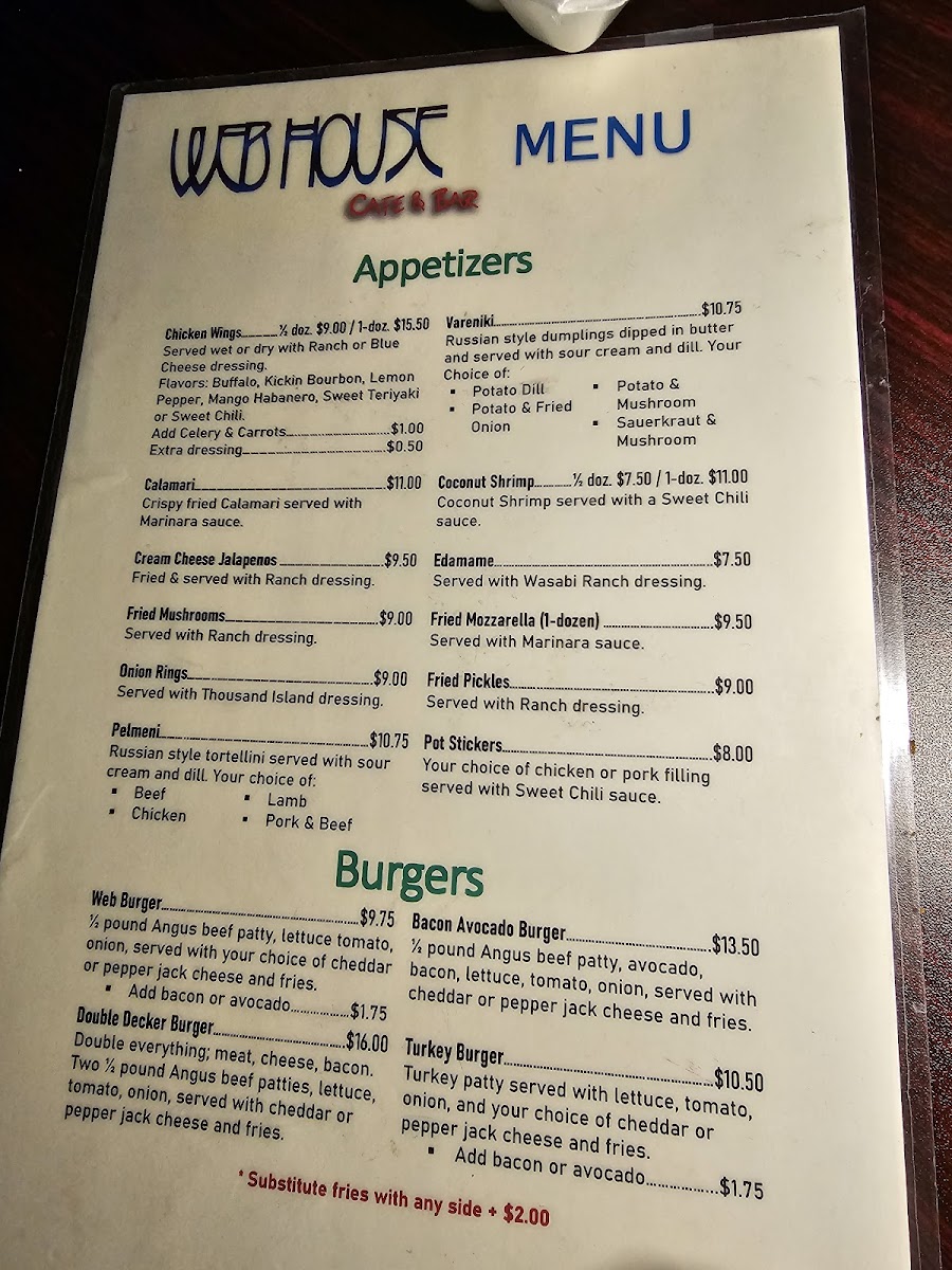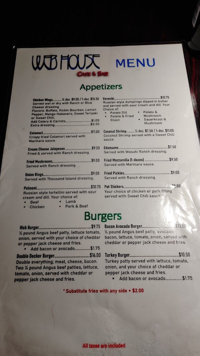 Welcome to Web House Café & Bar, a hidden gem located at 320 Blanco Rd, San Antonio, TX. This cozy neighborhood spot combines a vibrant atmosphere with an impressive menu that elevates standard bar fare. With standout dishes like the grilled pork and chicken kabobs at just $8.95, and a mouthwatering ribeye steak for $12.95, there’s something for everyone.